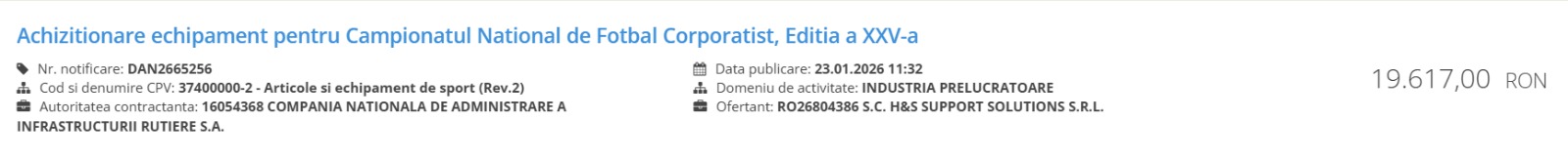 CNAIR a publicat în ianuarie 2026 o achiziție pentru „Echipament pentru Campionatul Național de Fotbal Corporatist, Ediția a XXV-a”, în valoare de 19.617,00 lei, prin codul CPV 37400000-2 - Articole și echipament de sport (Rev.2), contract atribuit societății S.C. H&S SUPPORT SOLUTIONS SRL. CNAIR a găsit rapid bani pentru tricouri, șorturi și probabil ghete cu crampoane.