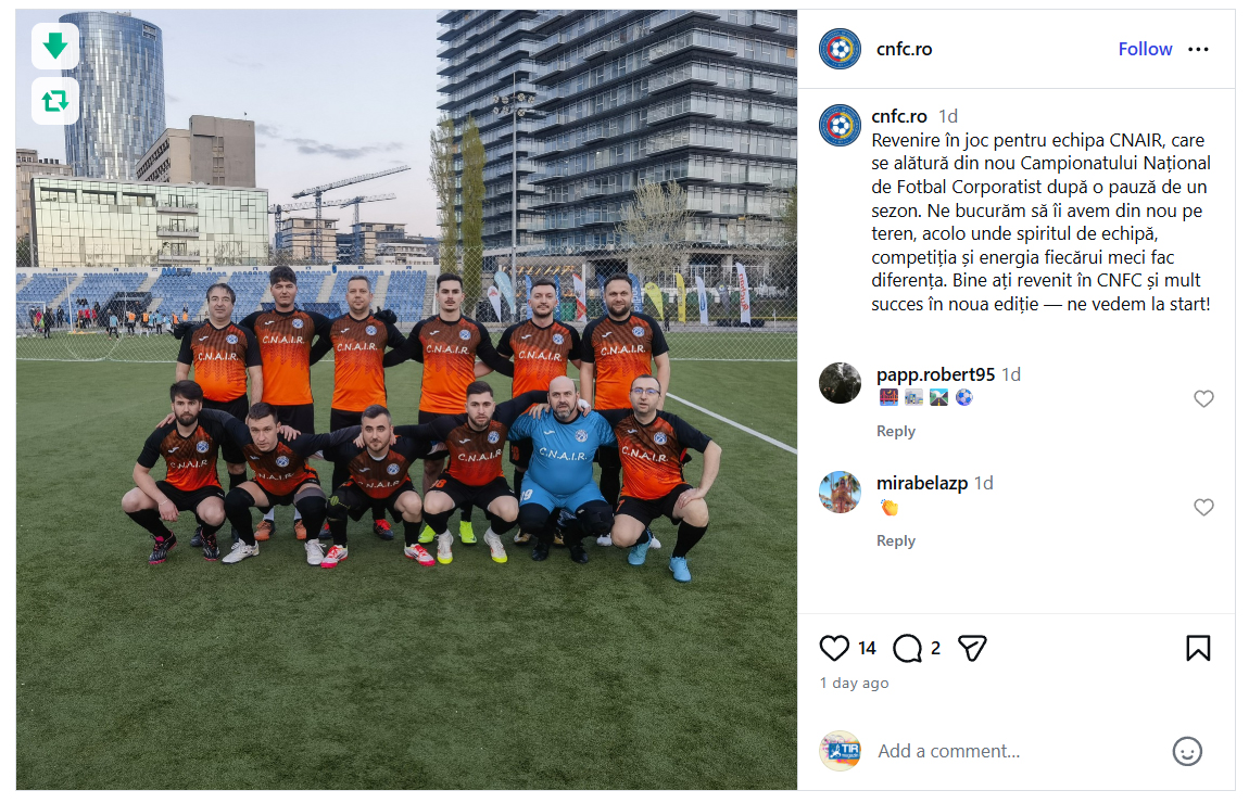 Sub managementul dezastruos al directorului general Cristian Pistol, zis "Coarne", "băiețașii" din CNAIR au decis să nu își refuze nicio plăcere, chiar dacă e costisitoare. Firma privată care organizează pe bani mulți Campionatul Național de Fotbal Corporatist (CNFC), a anunțat, pe 11 februarie 2026, cu mult entuziasm pe Instagram: „Revenire în joc pentru echipa CNAIR, care se alătură din nou Campionatului Național de Fotbal Corporatist după o pauză de un sezon. Ne bucurăm să îi avem din nou pe teren, acolo unde spiritul de echipă, competiția și energia fiecărui meci fac diferența. Bine ați revenit în CNFC și mult succes în noua ediție — ne vedem la start!”.