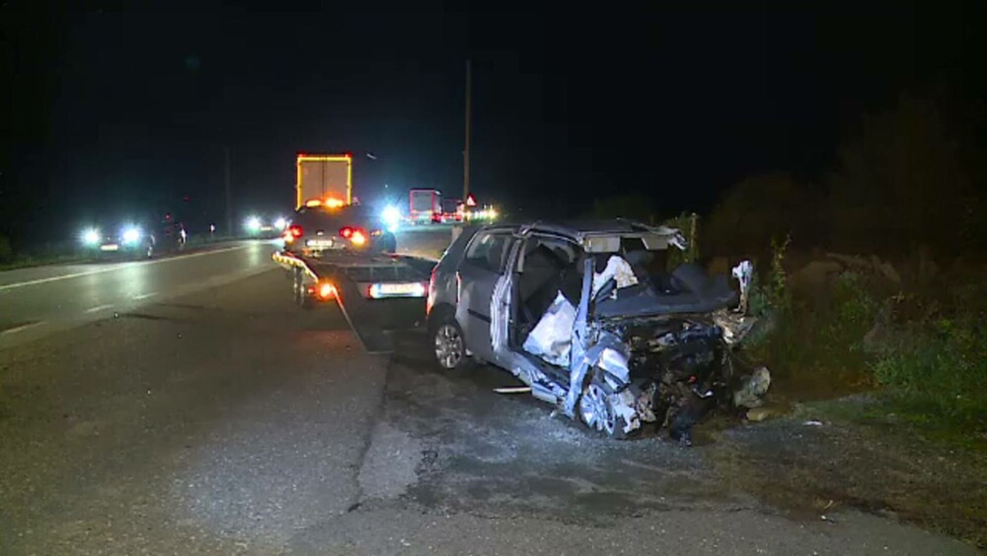 Impactul a fost atât de violent, încât partea din față a mașinii a fost aproape în totalitate distrusă, iar autotrenul s-a răsturnat în șanț.