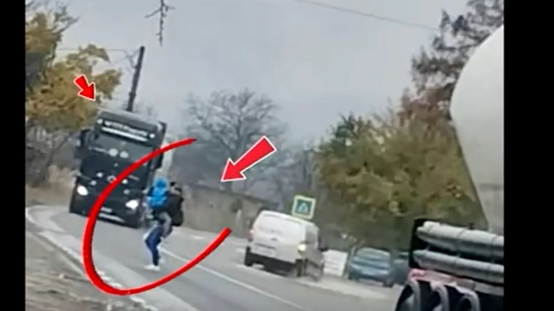 Imaginile au fost publicate în mediul online. O femeia care ține un copil în brațe traversează prin loc nepermis o șosea aglomerată. Ea trece chiar printre două tiruri care circulau pe drum.