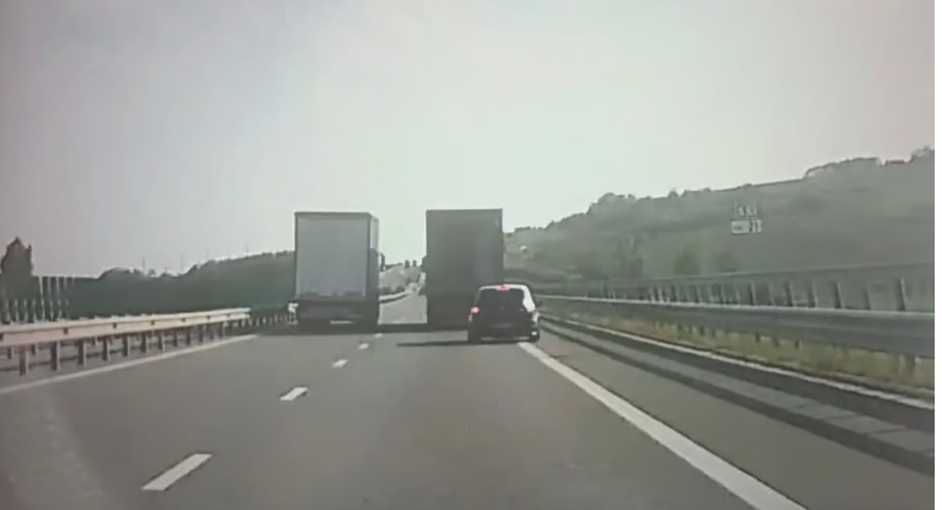 VIDEO Șofer, enervat că a fost blocat de 2 camioane a depășit pe banda de urgență